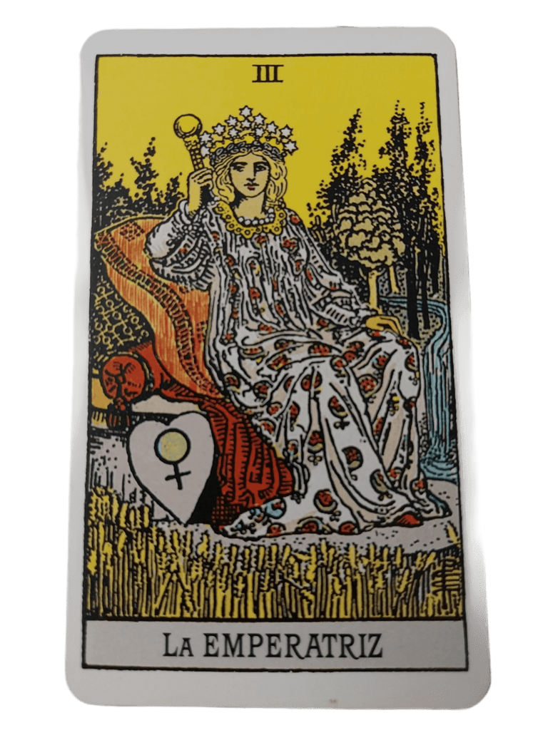 Esta carta representa la parte creativa de lo femenino. Esta asociada a la abundancia, la fertilidad, creatividad, a la naturaleza, las artes, la elegancia y a la belleza. En su aspecto negativo nos estaría hablando de codicia, posesividad y autoindulgencia.